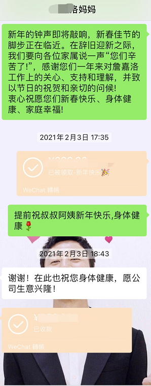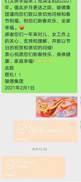 2021年伊始,骏德集团为感恩和公司一起奋斗的老员工,特向老员工父母发送春节感恩红包,感谢员工父母一直以来对子女工作上的关心、支持和理解以及对于骏德集团的信任,也让其子女在骏德的工作成绩被父母看到,并让父母为之骄傲。 骏德承诺:回报员工,为客户创造价值,与合作伙伴共赢,回馈社会。 感恩一路前行的骏德家人们,同时也欢迎有更多的新鲜血液加入骏德这个大家庭中,我们一起奋斗,创造属于自己的一片天地。