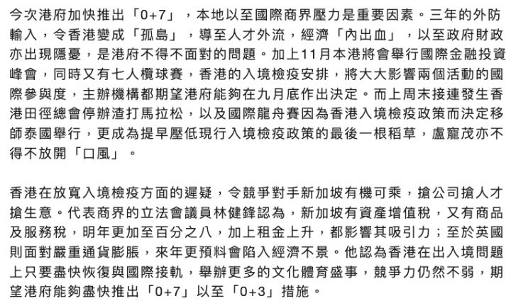 最近,香港各界更提出要进一步放宽入境检疫措施,从目前的“3+4”(3天酒店隔离+4天居家)改为“0+7”方案。