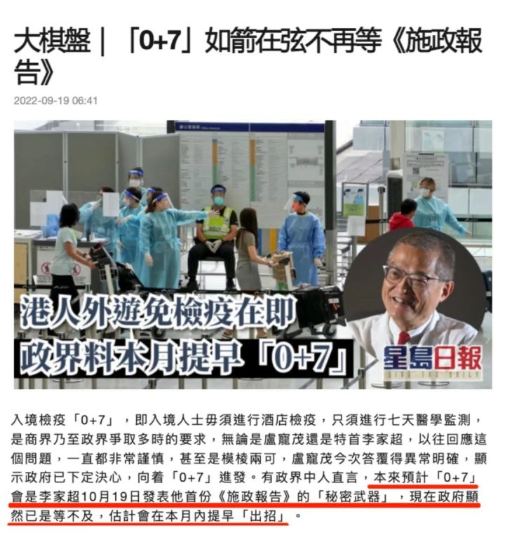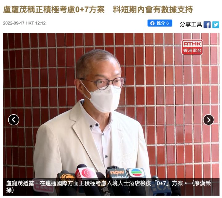 对此,香港医务卫生局局长卢宠茂在刚过去的周六表示:政府对缩减酒店检疫持正面态度,正积极考虑入境人士酒店检疫“0+7”方案,相信短期内会有酒店检疫数据支持。